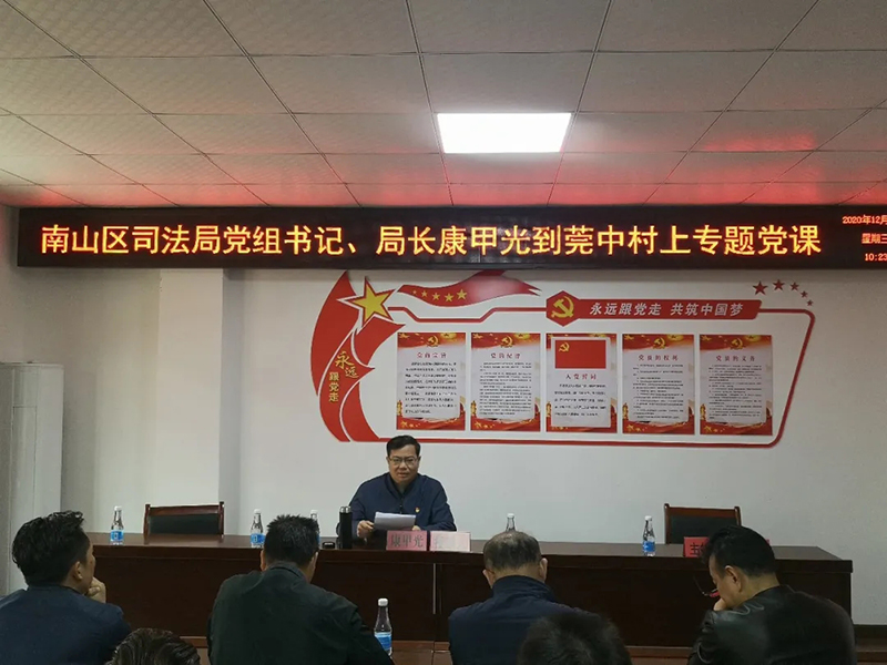 南山区司法局党组书记、局长康甲光为莞中村的党员干部宣讲习近平在中央全面依法治国工作会议上的重要讲话精神。