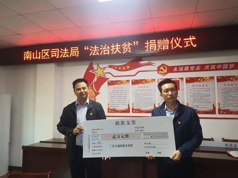 在“法治扶贫”的捐赠仪式上,林志强同志代表宝城所发言。他说,在南山区司法局的带领下,连续3年对莞中村开展定向法治扶贫活动,村民的法治意识得到提升,现在村风村貌有很大改善,环境也优美很多,由此可见“法治扶贫”的重要性;同时,他也表示宝城所在之后的工作中,会积极响应上级部门开展的此类工作,更多地参与其中。之后,林志强同志代表宝城所向莞中村捐款2万元。