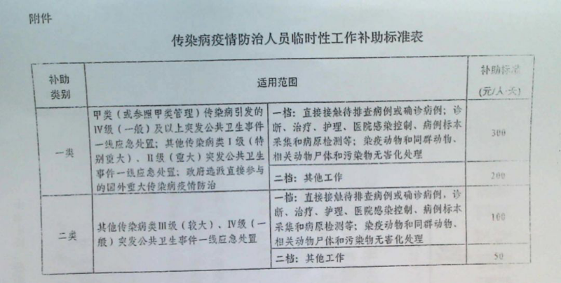 参加防治工作的医务人员和防疫工作者发放临时性工作补助,中央财政按照规定的标准安排经费。