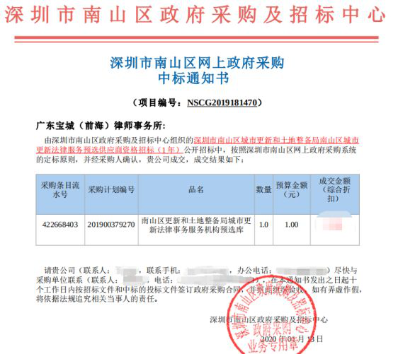 关山初度尘未洗,策马扬鞭再奋蹄!宝城所圳法团队喜迎2020年开门红!1月13日,圳法团队以最高的综合评分95.4286分中标深圳市南山区城市更新和土地整备局城市更新法律服务预选供应商资格。这是圳法团队继服务宝安区、龙华区、光明区、坪山区、罗湖区、盐田区城市更新和土地整备局后,第七个区城市更新和土地整备局聘请其担任法律顾问。2020年旗开得胜,圳法团队定将不负所托,提供更优质更专业法律服务!