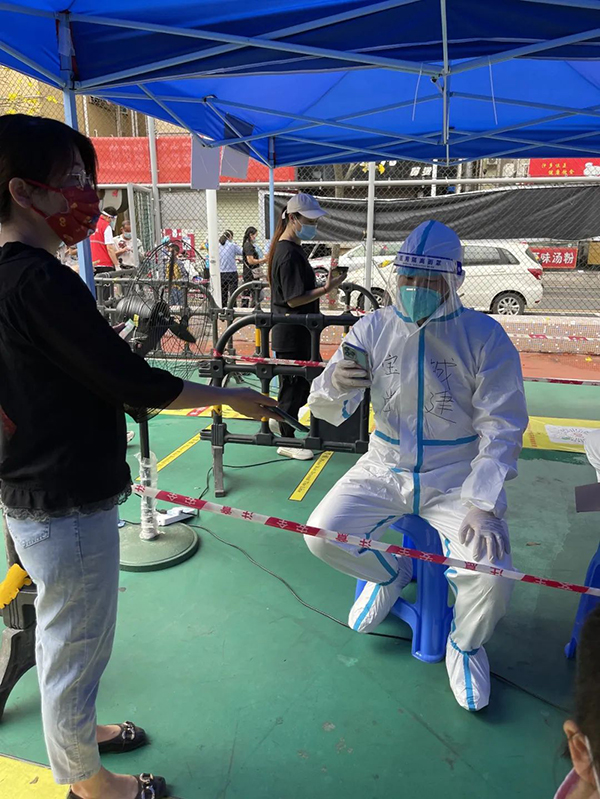 作为律师助理的我正式入职开始派驻社区工作,也恰逢深圳疫情最为严峻的时候。之前有好几次做过核酸检测,但是那时候我的身份只是受检人,这次身份不一样了,更多了一份责任感,这次我是防疫工作人员!第一次穿防护服,很是新鲜,无论是以前在网络看到,还是在做核酸现场看到,我都没想到有一天我会穿上。但是,这套防护服是真的很闷,特别是深圳这几天下午的大太阳。事实证明,网上那些医护人员脱了防护服都能倒出汗水来这事,真不是夸张!我这次主要负责扫粤核酸码,除了很热很闷,工作相对还是轻松的。现场有比我更辛苦的工作人员。因为这几天,深圳全市要求做核酸必须携带身份证,所以我前面有好几位义工哥哥姐姐们更辛苦了,他们还要苦口婆心地劝说社区群众携带身份证、安抚烈日下群众焦躁的情绪,他们这身防护服又不能随时脱下,这一站就是好几个小时,而这好几个小时也都没法喝水。当然,有很多暖心的群众会好好配合防疫工作,除了主动递出粤核酸码,还会在我扫码的时候耐心等待,之后也会说一句“谢谢”,甚至排队的时候,有的还会跟你唠嗑几句。这几天的工作让我越发地觉得,抗击疫情真的需要全市全国全世界的每一个人参与、配合,只有这样,疫情才能早日得以消除。在此,也由衷感谢所有医护人员以及其他防疫工作人员,这几年来你们真的辛苦了!我也由衷的希望,疫情早日消除,我们早日恢复不用戴口罩的自由!——郑静莉