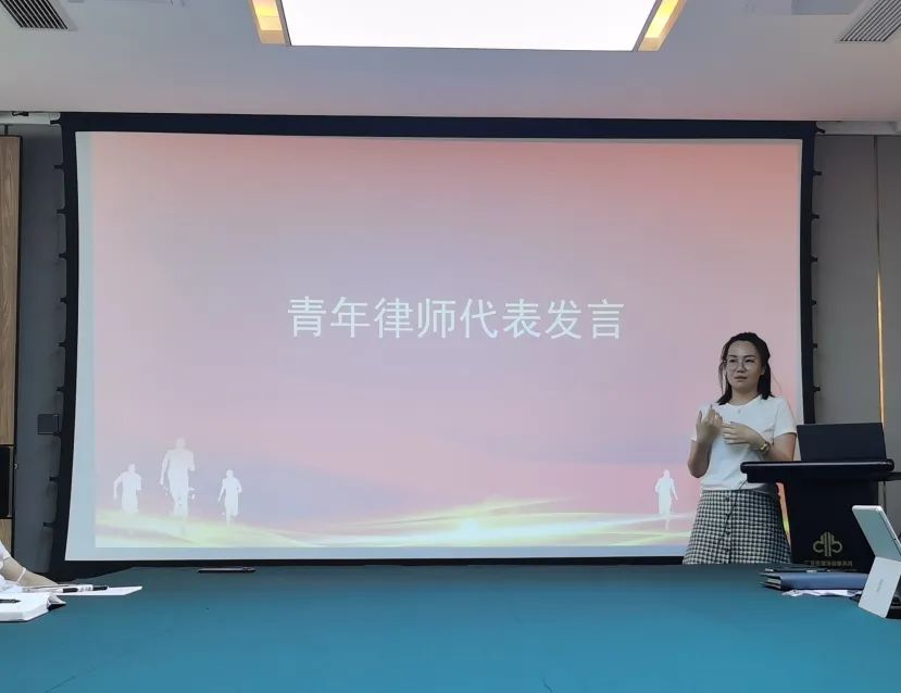 第二党支部书记彭素球接着进行发言。她用质朴的语言讲述亲身经历,表达了对青年律师的关怀和期待,对青年律师提出三点期望。一是要做一个成熟的人,坚信自己的选择,保持蓬勃的朝气,让自己充分地融入社会,保持政治上的成熟;二是要做一个学习的人,虚心向优秀律师前辈学习,让勤奋学习、终身学习成为人生远航的不竭动力;三是要做一个奋斗的人,忠诚事业,在接续奋斗中创造美好生活。