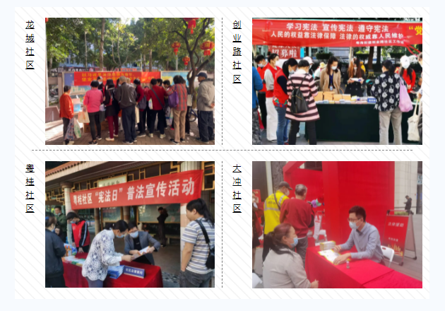 2021年12月4日是第八个国家宪法日,为深入学习宣传习近平法治思想,进一步弘扬宪法精神,营造尊崇宪法、学习宪法、宣传宪法、维护宪法,广东宝城律师事务所党总支、广东宝城律师事务所组织多位党员律师到行政机关、街道、社区开展宪法宣传活动。通过搭建法律咨询服务平台、发放宣传资料的形式,向人民群众宣传宪法及民法典等相关法律法规,免费为广大居民提供法律咨询服务。在各活动现场,宝城律师就大家咨询的工作和生活中遇到的法律法规问题答疑解惑约600多条,发放相关宣传材料约1800余份。