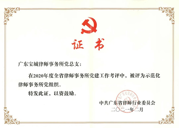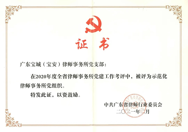 宝城所党总支及宝城所宝安党支部在2020年度全省律师事务所党建工作考评中,被广东省律师行业党委评为“示范化律师事务所党组织”。