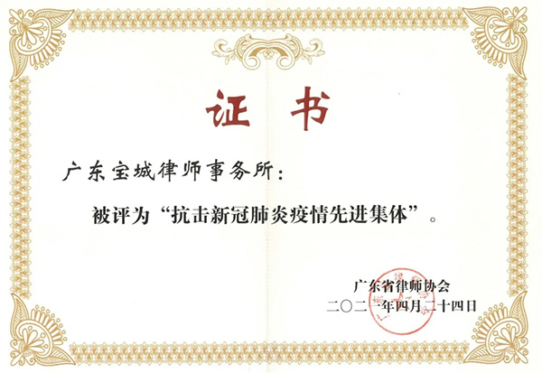 广东宝城律师事务所被广东省律师协会评为“抗击新冠肺炎疫情先进集体”。