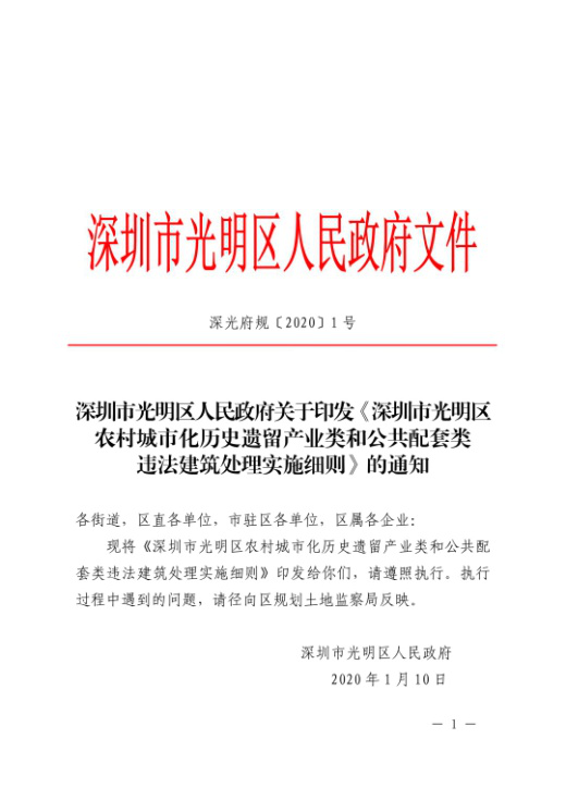 1月10日,光明区政府以“深光府规〔2020〕1号”文件正式印发《深圳市光明区农村城市化历史遗留产业类和公共配套类违法建筑处理实施细则》(以下称《实施细则》),自2020年1月20日开始实施。