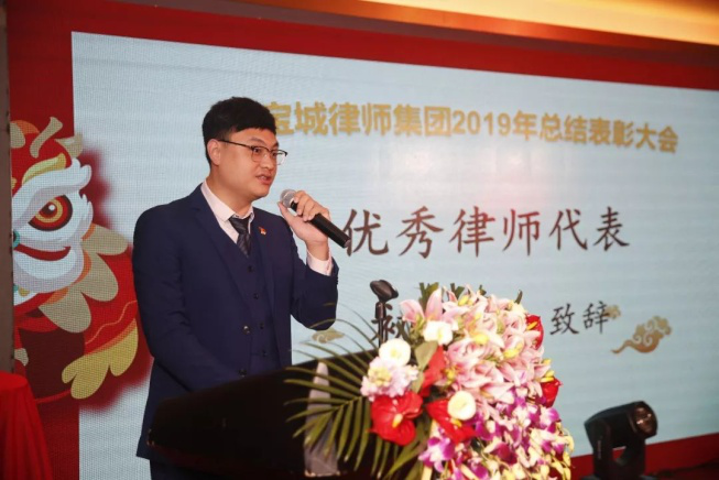 “优秀助理”代表李政泽发言,他说:我的进步,我们宝城2019新人的进步离不开宝城前辈律师的支持和教诲,宝城的战略性发展,更是离不开宝城人的辛勤努力。在此,我首先感谢林志强律师及君恒团队各位律师,感谢所有新人的指导老师,感谢所有宝城人的辛勤付出,愿你们在新的一年里,,数不尽的收获,有数不尽的快乐,数不尽的钞票,愿所有好运都属于我们。让我们以双臂去拥抱这个世界,我们不负韶华。