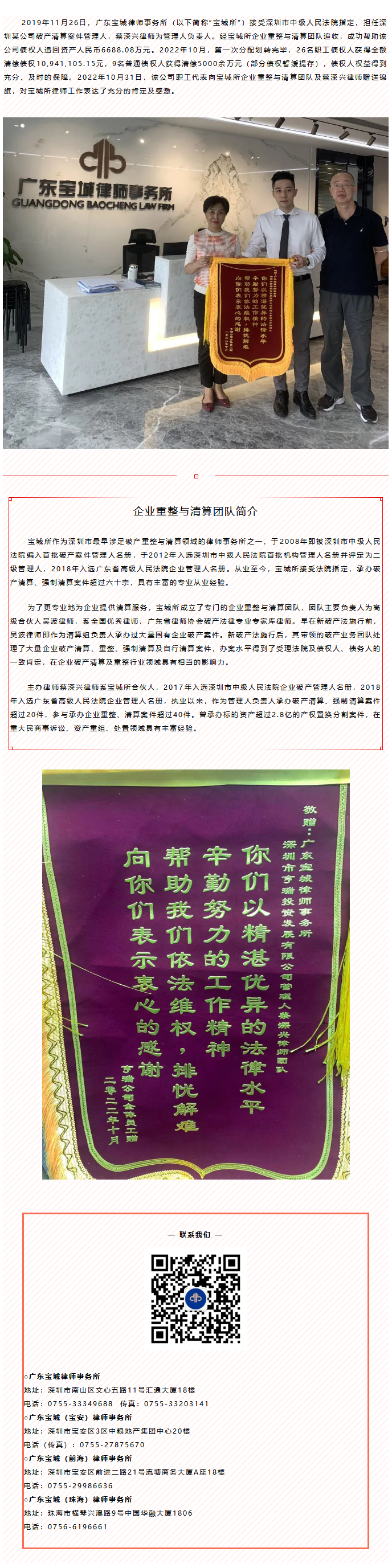 宝城动态宝城所企业重整与清算团队及蔡深兴律师获当事人赠锦旗