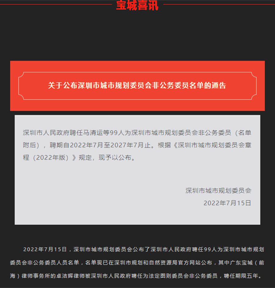 卓洁辉律师被深圳市人民政府聘任为法定图则委员会非公务委员