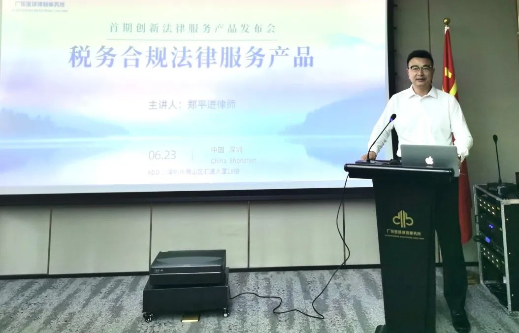 2022年6月23日下午,由广东宝城律师事务所业务创新委员会(以下简称“宝城所创新委”)主办的首期创新法律服务产品发布会于南山总所会议室召开,并同步进行网络会议直播。宝城所高级合伙人郑平进律师对深税团队创新成果——“企业税务合规法律服务产品”进行分享。本次产品发布会由康宁律师主持。