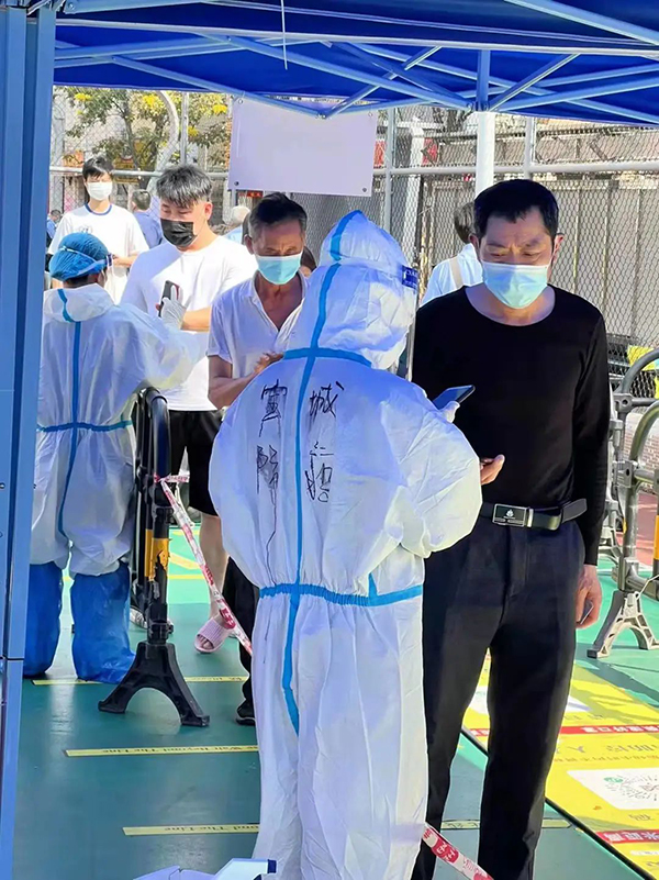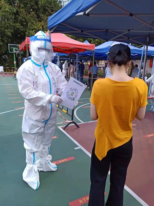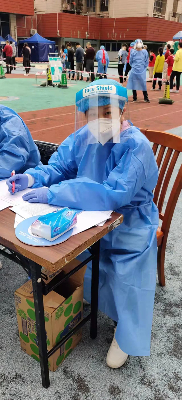 作为律师助理的我正式入职开始派驻社区工作,也恰逢深圳疫情最为严峻的时候。之前有好几次做过核酸检测,但是那时候我的身份只是受检人,这次身份不一样了,更多了一份责任感,这次我是防疫工作人员!第一次穿防护服,很是新鲜,无论是以前在网络看到,还是在做核酸现场看到,我都没想到有一天我会穿上。但是,这套防护服是真的很闷,特别是深圳这几天下午的大太阳。事实证明,网上那些医护人员脱了防护服都能倒出汗水来这事,真不是夸张!我这次主要负责扫粤核酸码,除了很热很闷,工作相对还是轻松的。现场有比我更辛苦的工作人员。因为这几天,深圳全市要求做核酸必须携带身份证,所以我前面有好几位义工哥哥姐姐们更辛苦了,他们还要苦口婆心地劝说社区群众携带身份证、安抚烈日下群众焦躁的情绪,他们这身防护服又不能随时脱下,这一站就是好几个小时,而这好几个小时也都没法喝水。当然,有很多暖心的群众会好好配合防疫工作,除了主动递出粤核酸码,还会在我扫码的时候耐心等待,之后也会说一句“谢谢”,甚至排队的时候,有的还会跟你唠嗑几句。这几天的工作让我越发地觉得,抗击疫情真的需要全市全国全世界的每一个人参与、配合,只有这样,疫情才能早日得以消除。在此,也由衷感谢所有医护人员以及其他防疫工作人员,这几年来你们真的辛苦了!我也由衷的希望,疫情早日消除,我们早日恢复不用戴口罩的自由!——郑静莉