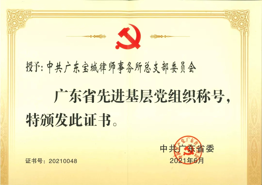 2021年6月29日上午,中共广东省委召开“两优一先”表彰大会,宝城所党总支被广东省委授予“广东省先进基层党组织”荣誉称号,这是我市首家荣获该项荣誉的律师所党组织。宝城所党总支书记曾常青同志参加了此次表彰大会。