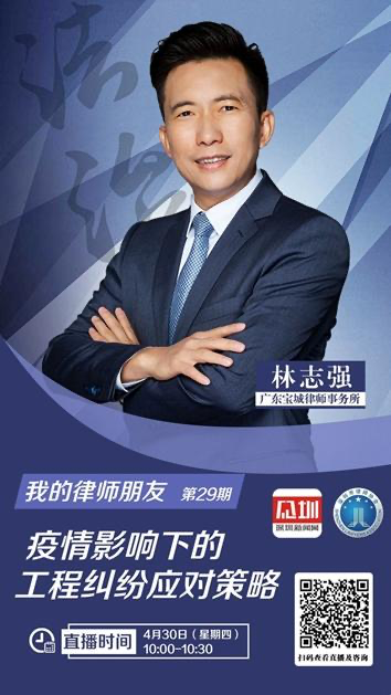 为积极响应抗疫工作,充分利用自身专业知识助力打赢疫情防控狙击战。宝城所高级合伙人林志强律师受深圳新闻网邀请,于4月30日上午做客深圳新闻网第29期“我的律师朋友”直播栏目,为网友送上一堂主题为《疫情影响下的工程纠纷应对策略》的法律网课。