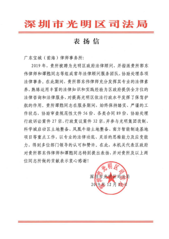 且倍感荣幸地,在2019年12月25日,深圳市光明区司法局特发出表扬信,对郭东伟律师带领的圳法团队提供的高质量法律服务提出表扬。
