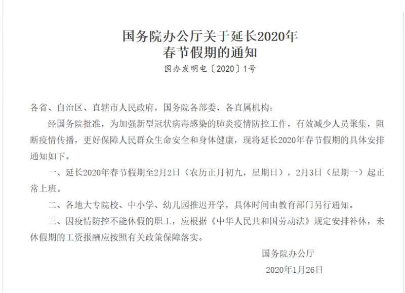 国务院办公厅于1月27日宣布延长2020年春节假期3天至2月2日,延长假期3天。