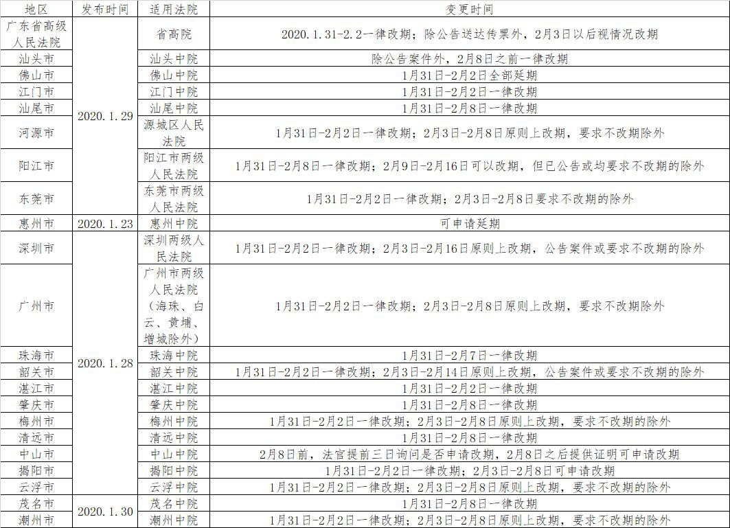 三、延长春节假期及推迟复工期间,广东省各级人民法院均相继发布通告调整了诉讼活动