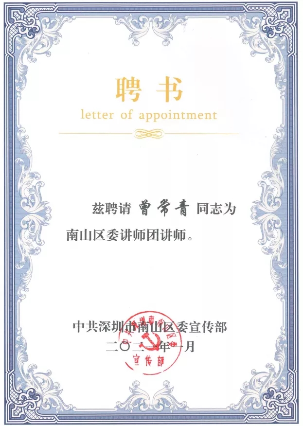 为深入学习、宣传、贯彻落实习近平新时代中国特色社会主义思想和总书记的重要讲话、重要批示指示精神,提质提速做好理论宣讲工作,打通基层理论宣讲“最后一公里”,深圳市南山区委宣传部组织有关专家、教授及先进人物代表等组建成立“南山区委讲师团”。2021年1月,我所党总支书记曾常青同志入选南山区委讲师团,成为受聘讲师。