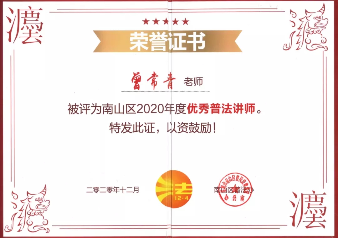 曾常青同志自担任由南山区律师行业党委在南山区党员律师先锋队的基础上组建的“民法典宣讲团”团长以来,积极开展南山区民法典巡回讲座,进行民法典普法工作。2020年12月,曾常青同志被南山区普法办评为“南山区2020年度优秀普法讲师”。曾常青同志以坚定的政治站位、资深的普法讲师经历、深厚的法学理论基础、突出的律师执业经验,得到深圳市南山区委宣传部的高度评价和认可。