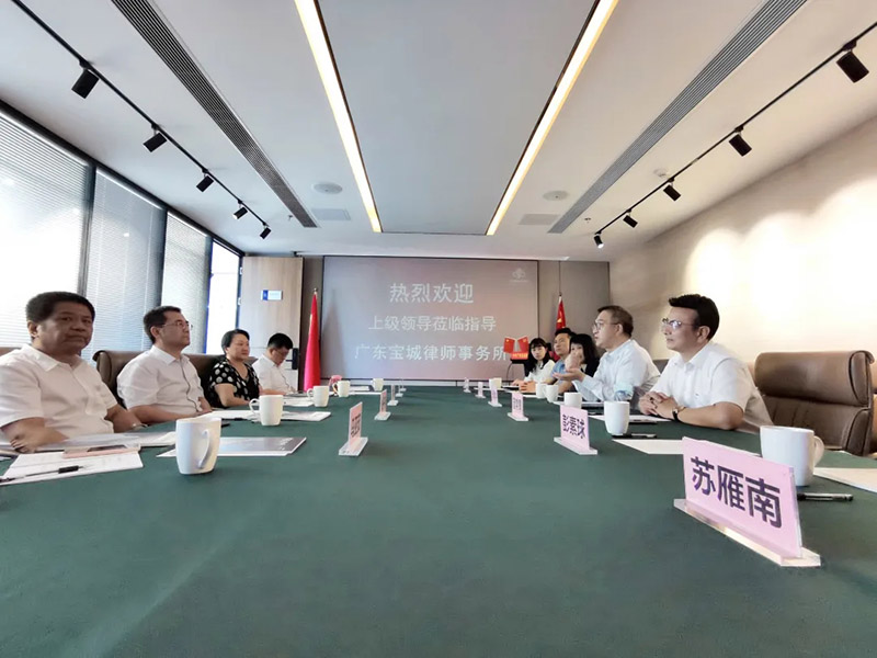 2020年7月22日下午,在深圳市律师行业党委副书记张善华的陪同下,西安市司法局副局长王安军,西安市司法局律师工作处处长李文阁,西安市律师协会会长、律师行业党委副书记姚子奇,西安市委组织部社会组织处主任科员任军鹏,西安市司法局律师工作处主任科员马亚茹一行到访广东宝城律师事务所进行党建调研,一起陪同的还有深圳市律师行业党委党建工作顾问苏雁南,深圳市律师行业党委办公室组织员陈璇玲。宝城所集团主席吴波主任,宝城所党总支书记兼执行主任曾常青,党总支委员、第一党支部书记、高级合伙人林志强,党总支委员、第二党支部书记、高级合伙人彭素球热情接待并参加座谈。