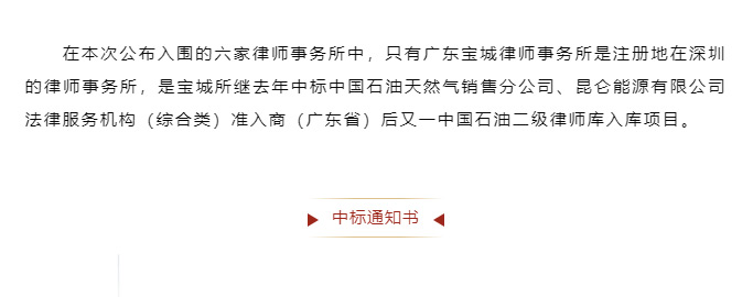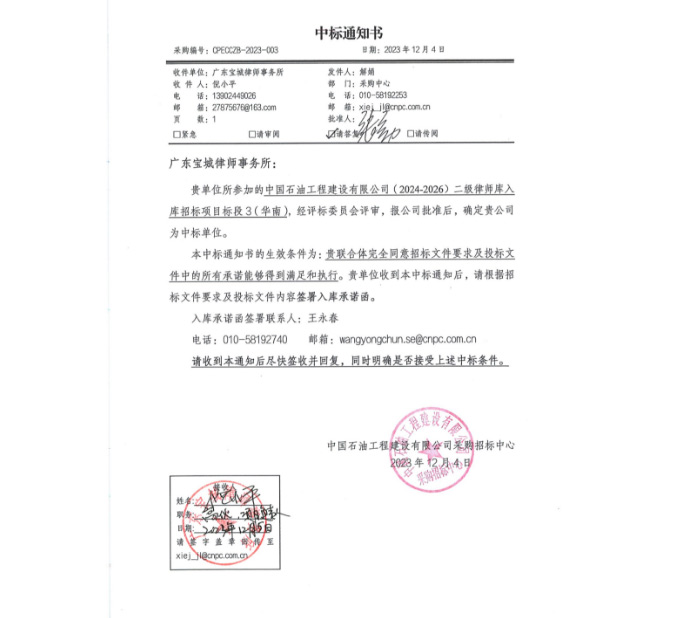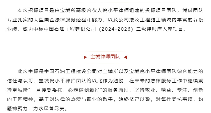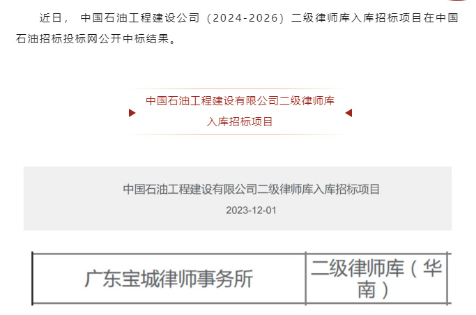 宝城业绩|宝城所成功中标中国石油工程建设有限公司(2024-2026)二级律师库入库招标项目